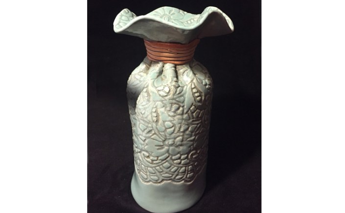 Light turquoise gathered vase with coiled neck