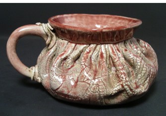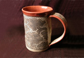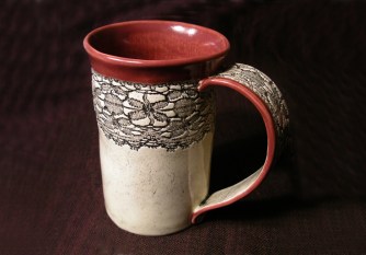 Ruby red porcelain 12 oz. mug with lace and stamped texture