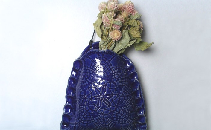 Blue pinched wall pocket with lace impression